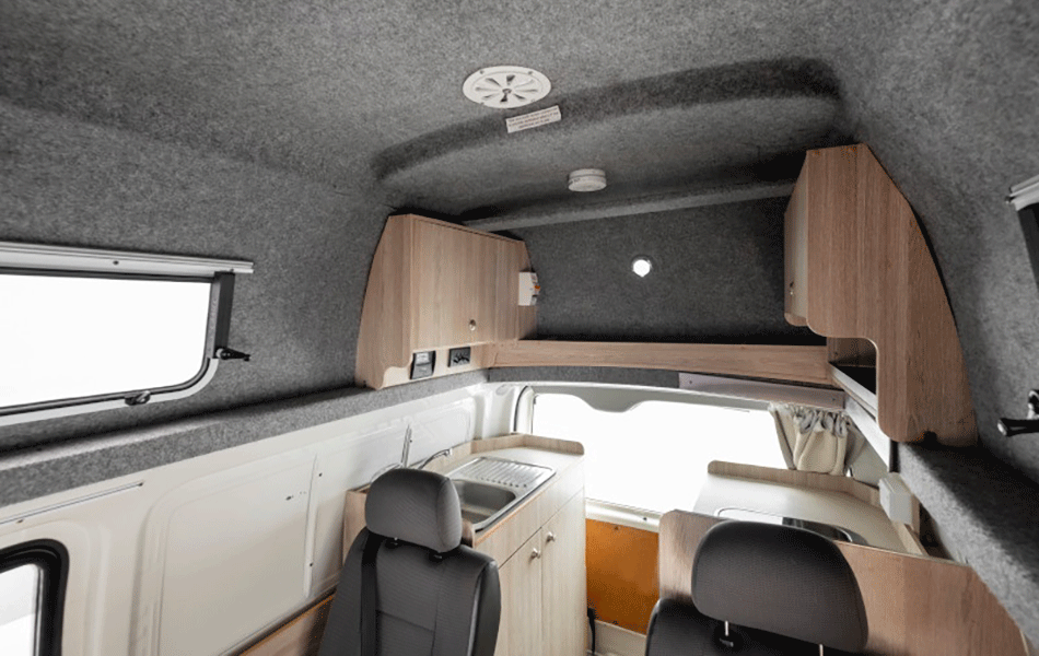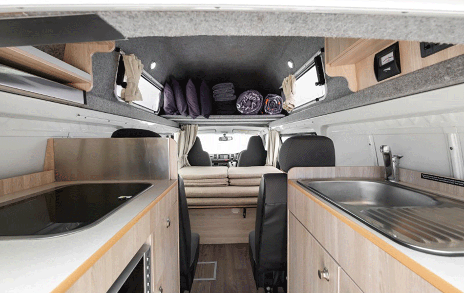 Bettdecke, Kopfkissen, Bettwäsche, Küchen- und Handtücher, Geschirr und Kochutensilien: Teller, Schüssel, Gabeln, Messer, Löffel, Flaschen- und Büchsenöffner, Sieb, Bratpfannen, Töpfe, Schneidebrett, Toaster, Wasserkocher