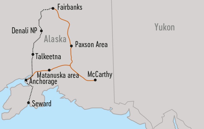 21 Tage/20 Nächte , ab/bis Anchorage oder Whitehorse, ca. 4060 km, Abfahrt täglich 29.5. - 2.9.2025 (ab Anchorage); 29.5. - 29.8.2025 (ab Whitehorse)