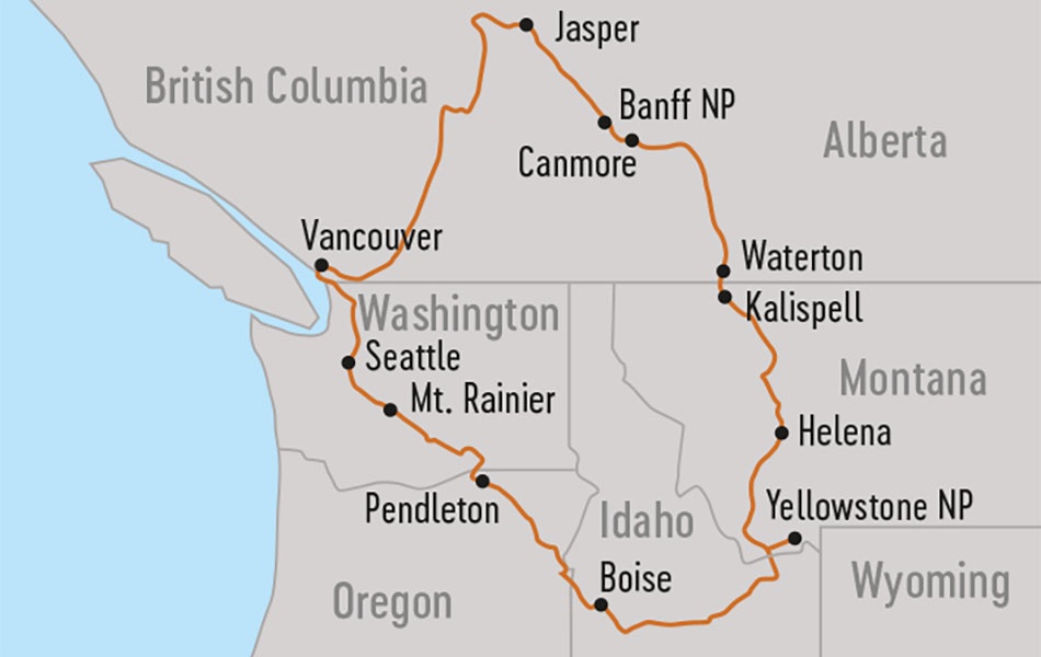 Bei dieser Tour besuchen Sie die amerikanischen Bundesstaaten Montana, Wyoming, Idaho, Oregon und Washington und die beiden kanadischen Provinzen British Columbia und Alberta. In den neun Nationalparks, die Sie auf dieser Reise besuchen - unter anderem die weltbekannten Nationalparks Banff und Jasper in Kanada sowie Glacier und Yellowstone