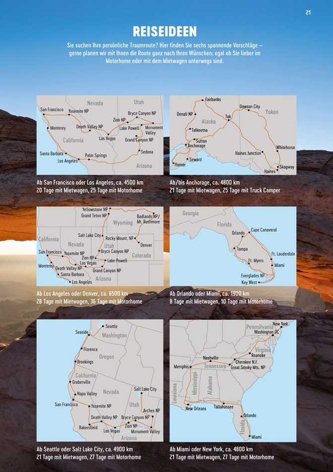 Bekannt und doch überraschend – ein Land mit gigantischen Ausmassen, abwechslungsreich wie kaum ein anderes. Der Westen überwältigt mit seinen Nationalparks und der Glitzerstadt Las Vegas. Kalifornien, Florida und Hawaii wissen mit Traumstränden zu entzücken, der Nordosten verzaubert die Besucher vor allem während des farbenfrohen Herbstes, in den Südstaaten kommen Musikliebhaber auf Ihre Kosten und was wären die USA ohne die Metropole New York oder das wilde Alaska?